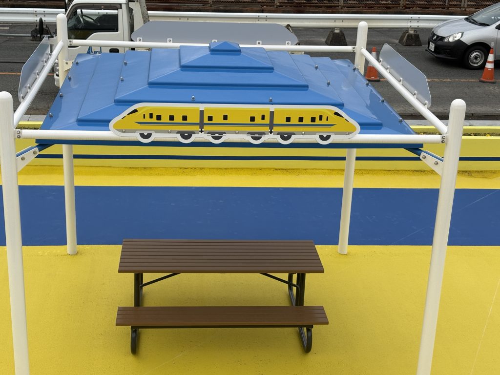 ベンチのそばにはドクターイエローを思わせるモチーフもあり、公園全体の雰囲気がまるでドクターイエローそのもの。