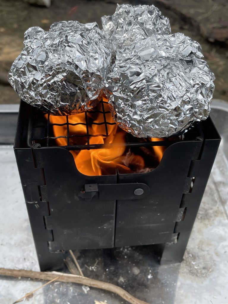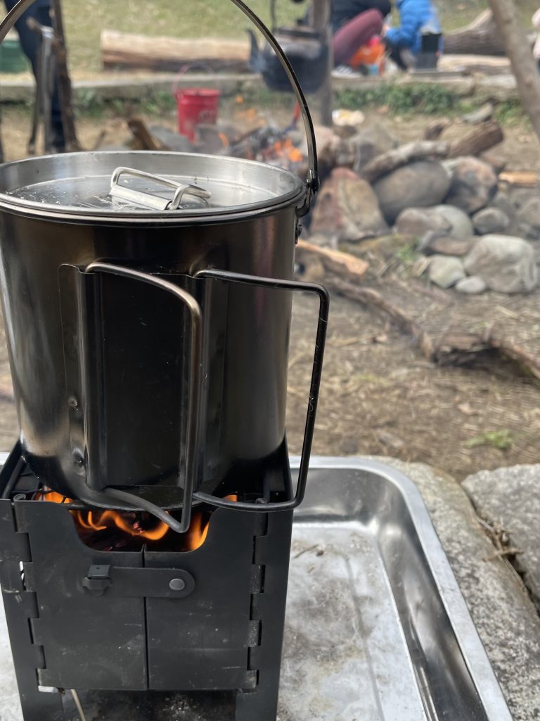 火をおこし、お湯を沸かしカップ麺や、焼きおにぎりを食べました。
