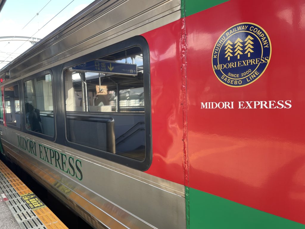 昨日乗車した特急みどりは、早岐駅でハウステンボス号と切り離し佐世保へ向かう特急で、昔JR九州で流行ったハイパーサルーンの車両でした。