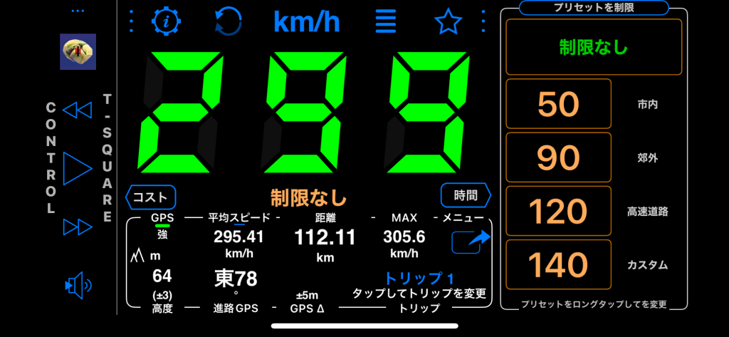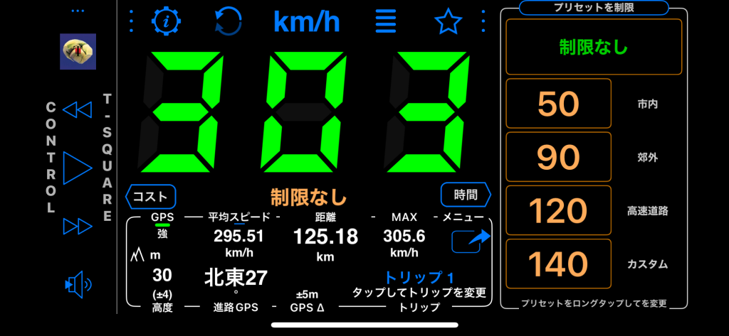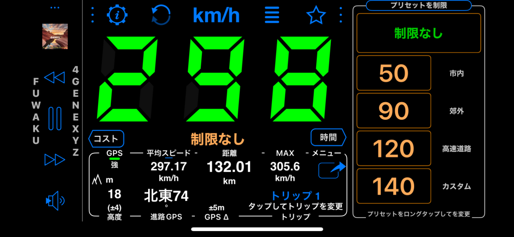 GPSで速度を検測するアプリなので多少の誤差はあるものの、さすが山陽新幹線区間、博多を出て若宮あたりから300キロをマーク!