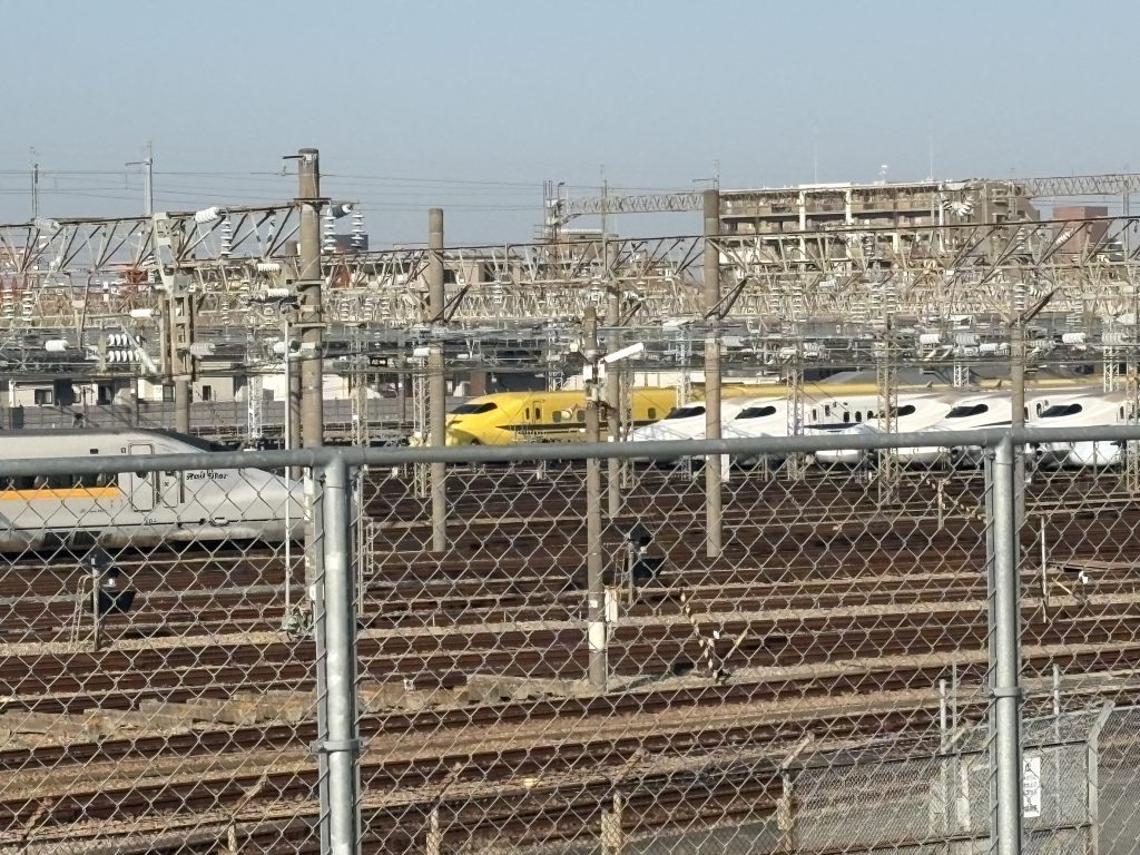 停まっている新幹線がよく見え、ドクターイエローが福岡に来ている日は、その黄色い車体が抜群に目立ちます。