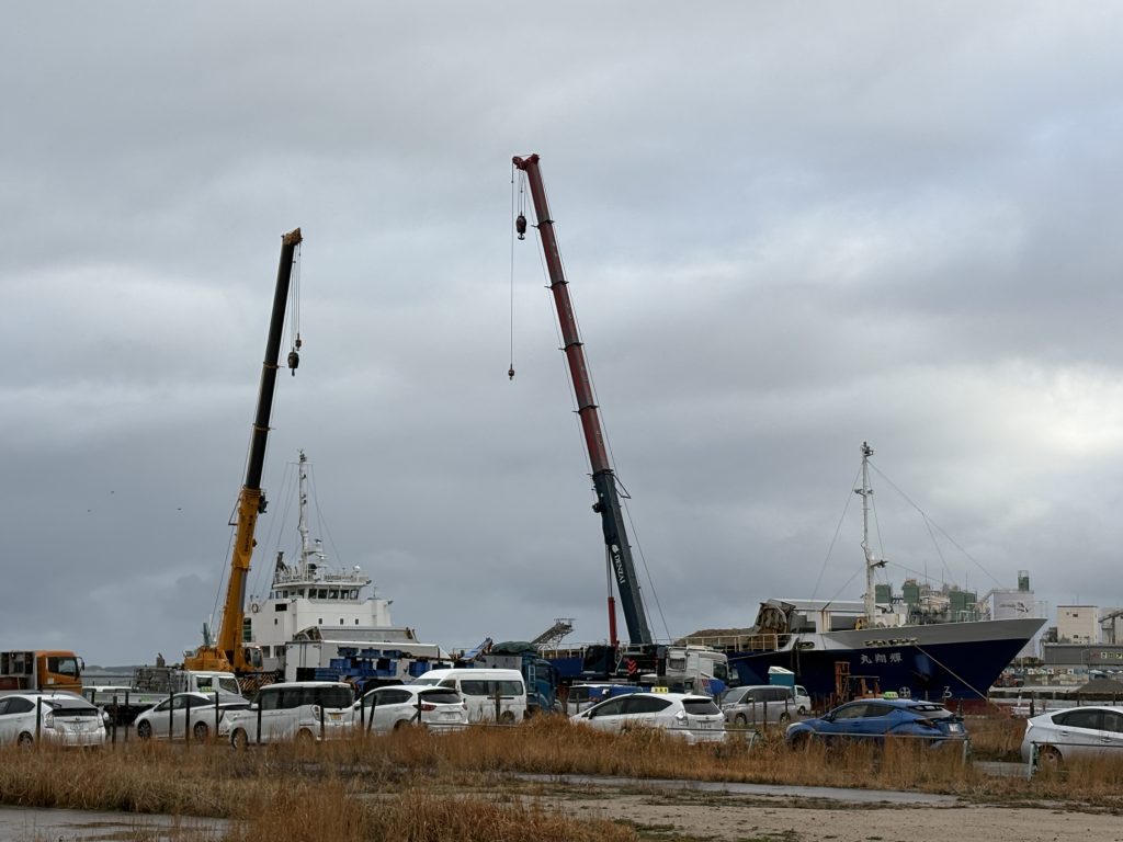 港の一角では、大型クレーンが組み上げられ、現場はどこか慌ただしい様子。
