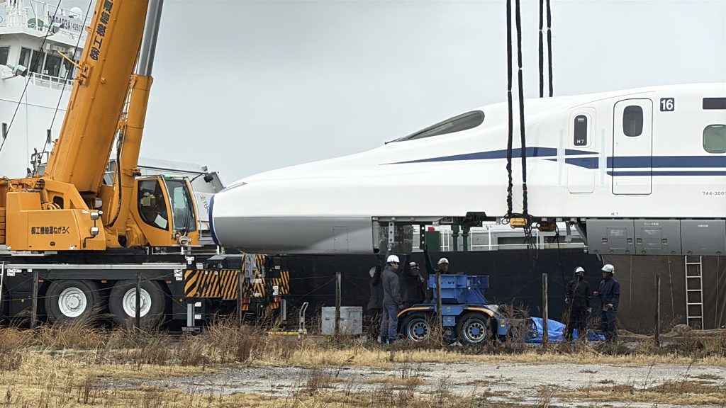 博多港では、新幹線N700Sの車両が海から陸へ引き上げられる