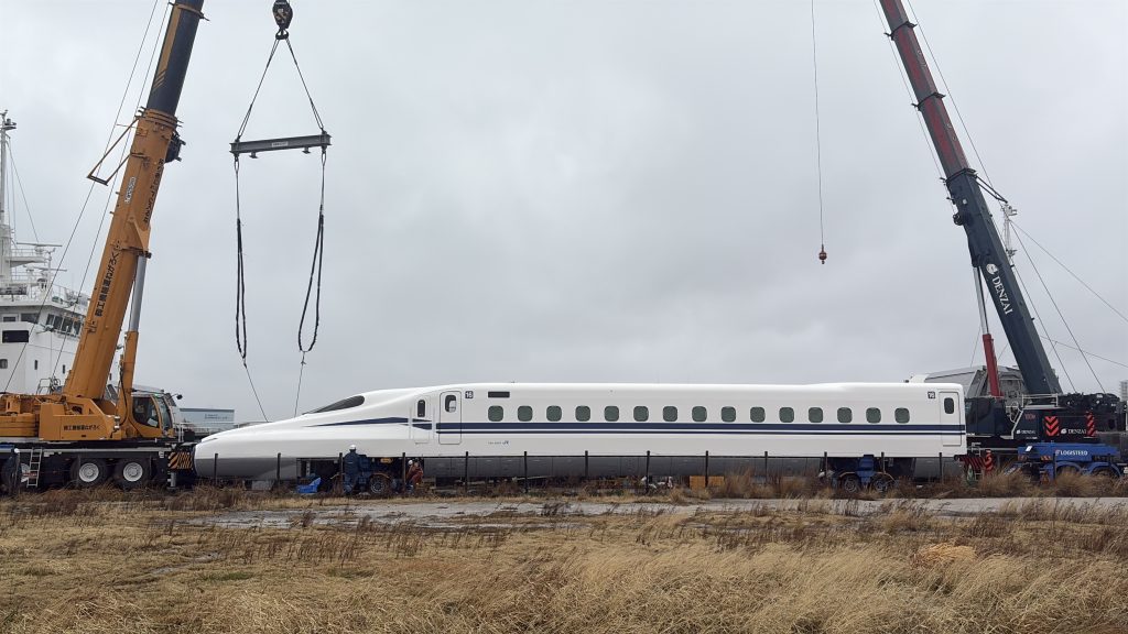 新幹線の車両が海上輸送で博多港に到着し、陸へと引き上げられる――そう、あの「水切り作業」の日です。